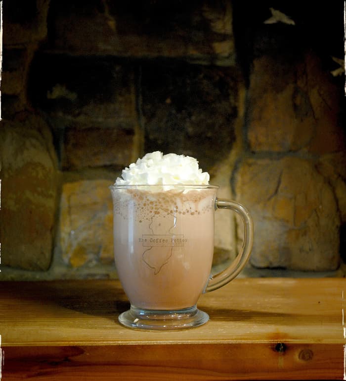 Velvety and rich chocolate drink combining milk and chocolate topped with whipped cream